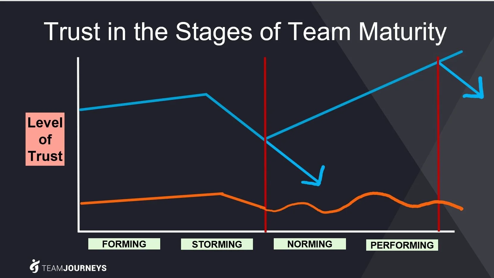 The orange line shows a team that started with little to no trust. In this condition, a team is unable to get through conflict in the Storming Stage. A roller coaster of emotions is to be expected as the team continues to work together.